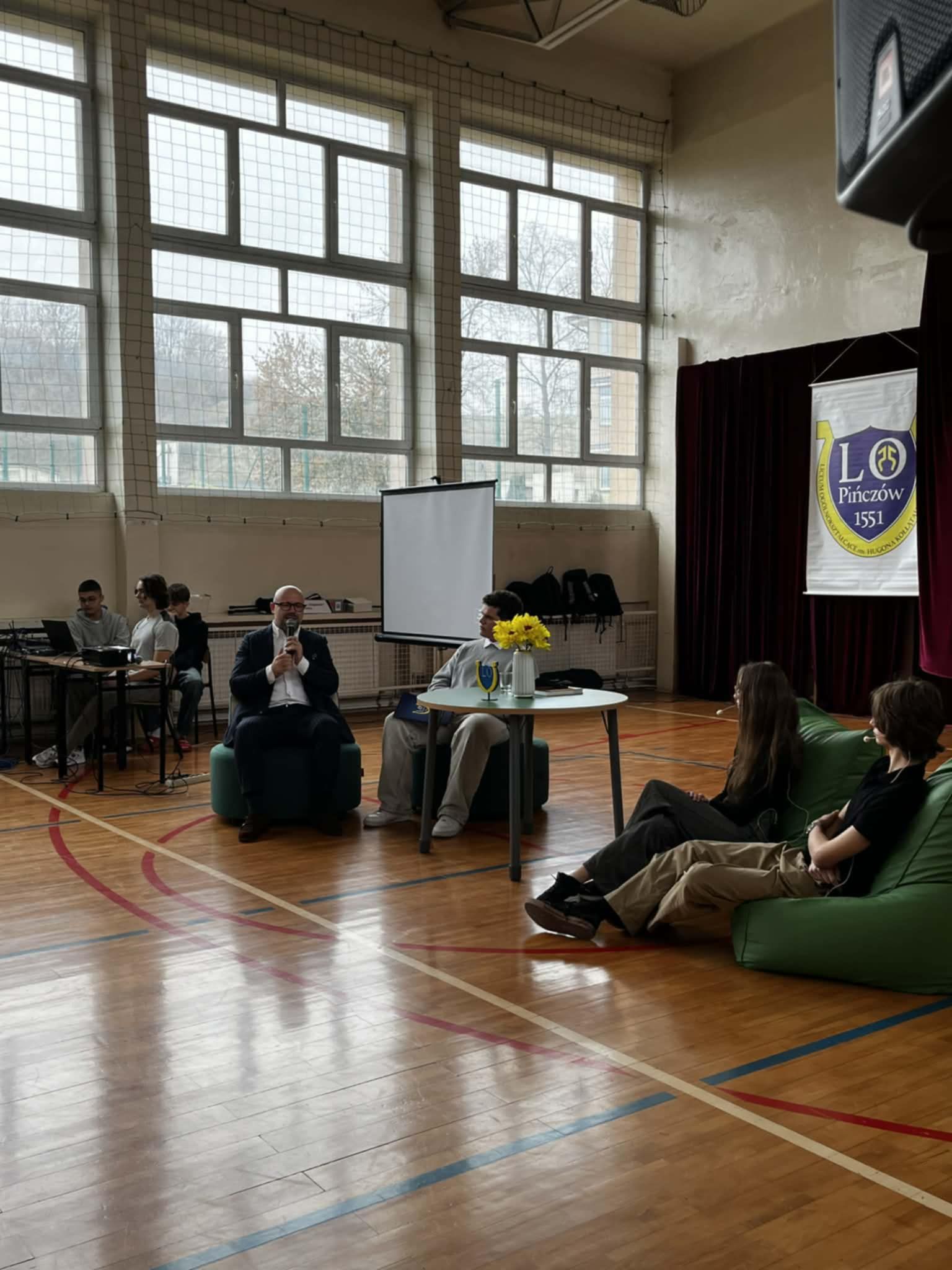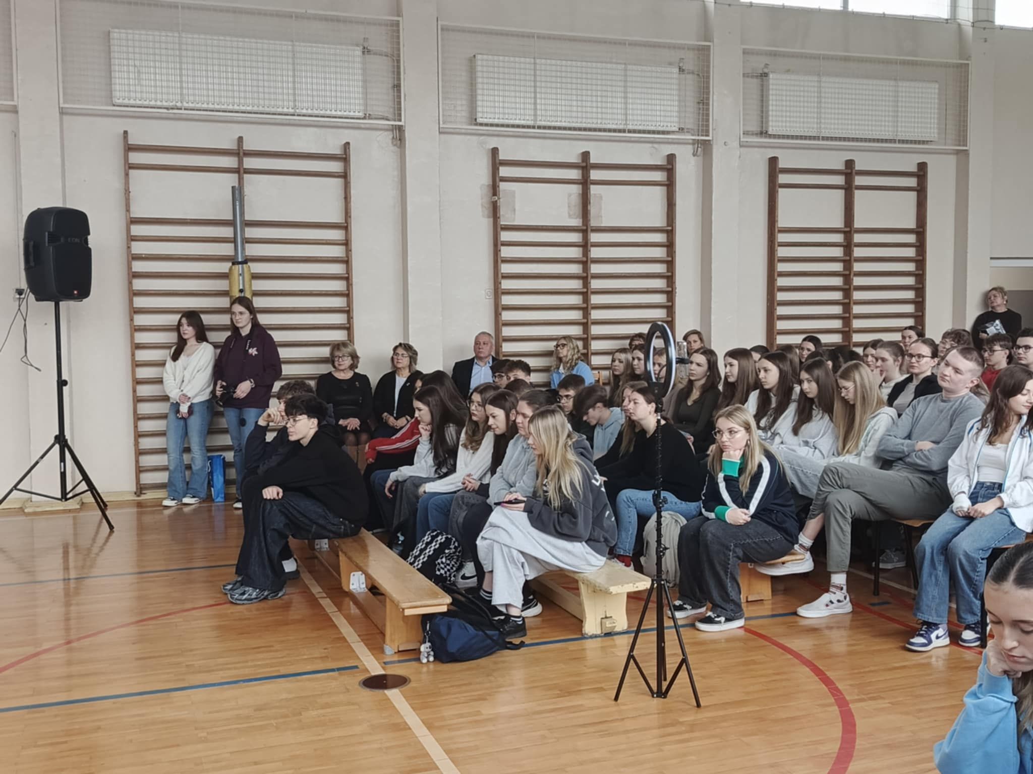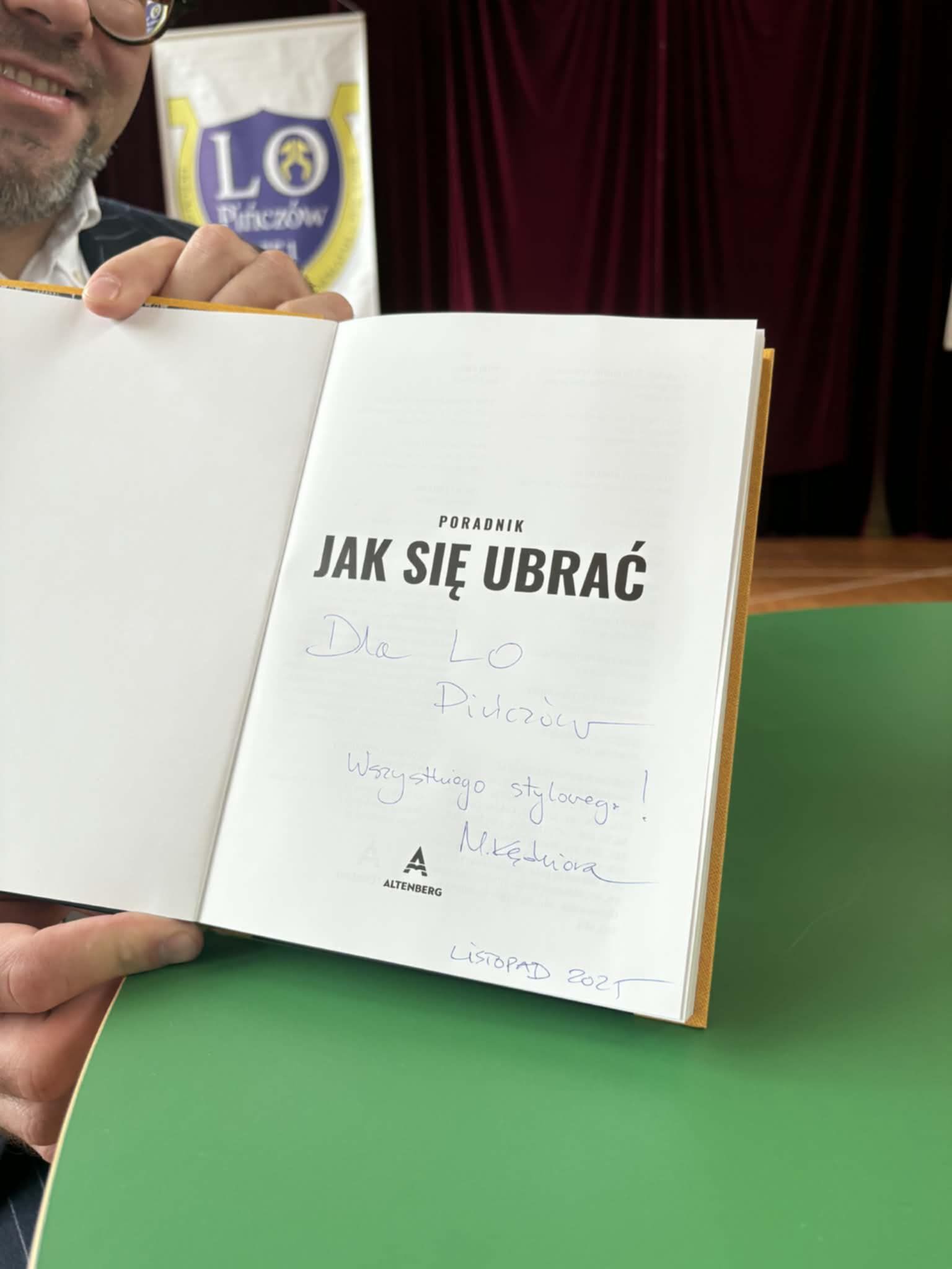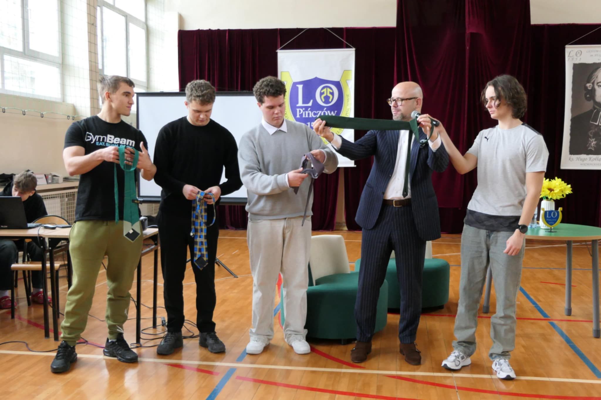 Gościa przywitał pan dyrektor Tomasz Pietrzykowski, natomiast spotkanie poprowadzili autorzy projektu: Maksymilian Kędzierski, Nela Pietrzykowska i Jan Kawiorski. W trakcie realizacji projektu byli oni także wspierani przez Natalię Młyńczak oraz Antoniego Michalskiego. Rozmowa dotyczyła ubraniowego savoir-vivre, związanego zarówno z ubiorem do szkoły, czyli jak na co dzień ubrać się wygodnie i estetycznie jednocześnie. Przede wszystkim jednak poruszano kwestię bardziej formalnych okazji, takich jak studniówka, osiemnastki czy uroczystości rodzinne. Pan Michał podzielił się wieloma praktycznymi wskazówkami, a także odpowiedział na liczne pytania uczniów zgromadzonych na sali. Opowiedział nie tylko o zasadach elegancji, ale także o swojej pracy i doświadczeniach z nią związanych. Dodatkową atrakcją była prezentacja jednej z technik wiązania krawata. Ta umiejętność z całą pewnością już niebawem przyda się naszym tegorocznym maturzystom przed studniówką i maturą. Podczas wydarzenia autorzy projektu podziękowali również jego patronowi, bez którego jego realizacja nie byłaby możliwa. Szczególne wyrazy wdzięczności kierujemy do ,,Stowarzyszenia Społeczno-Kulturalnego dla Ponidzia’’, reprezentowanego podczas spotkania przez panią Jadwigę Irlę oraz panią Grażynę Robak. Dziękujemy !![]()