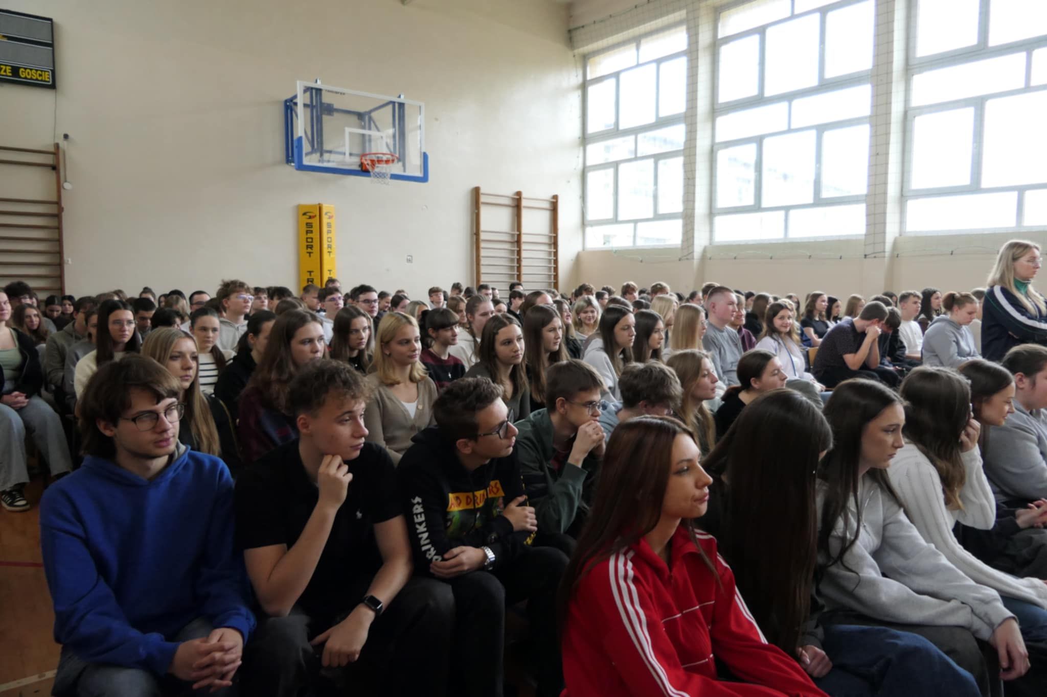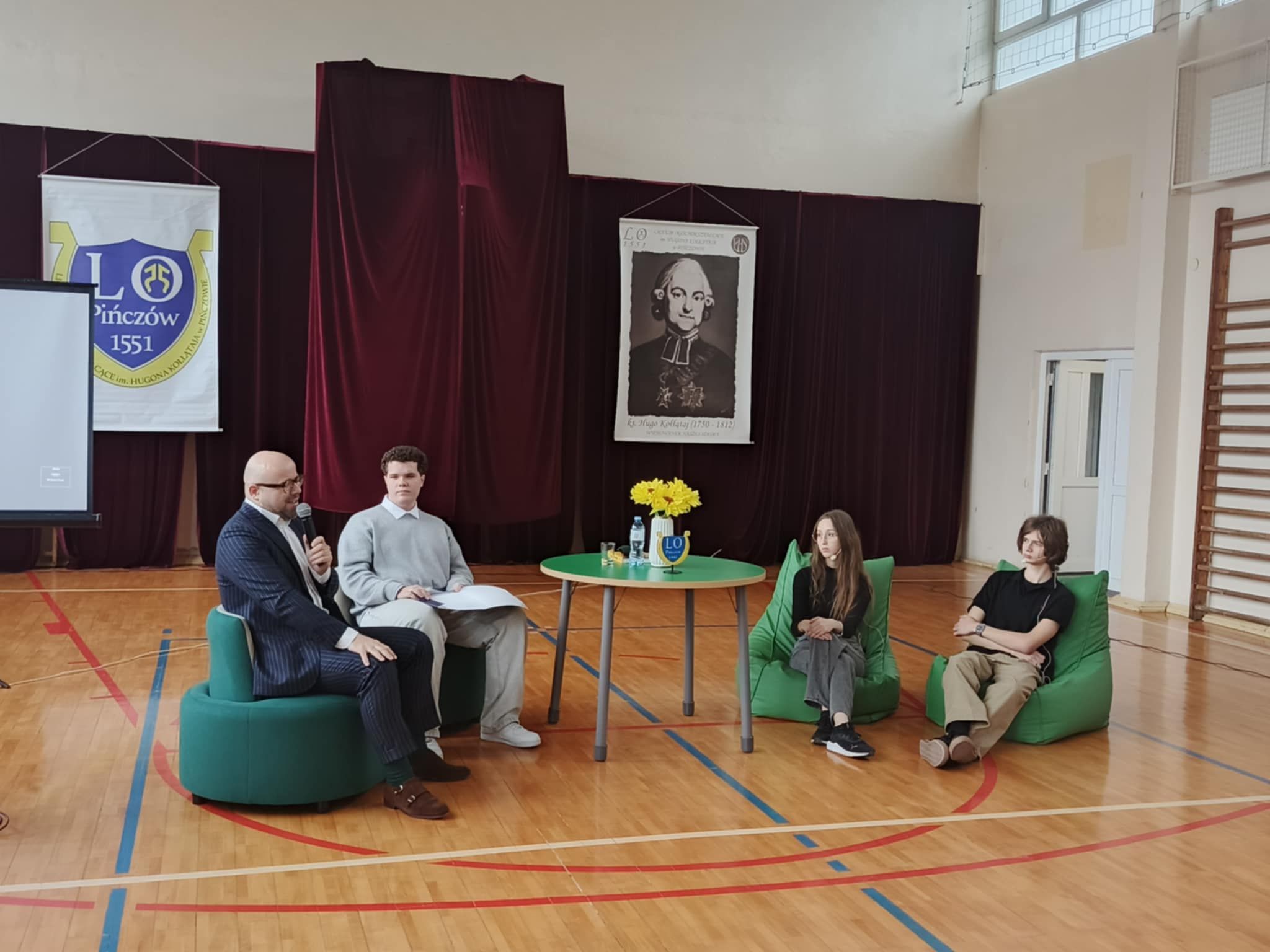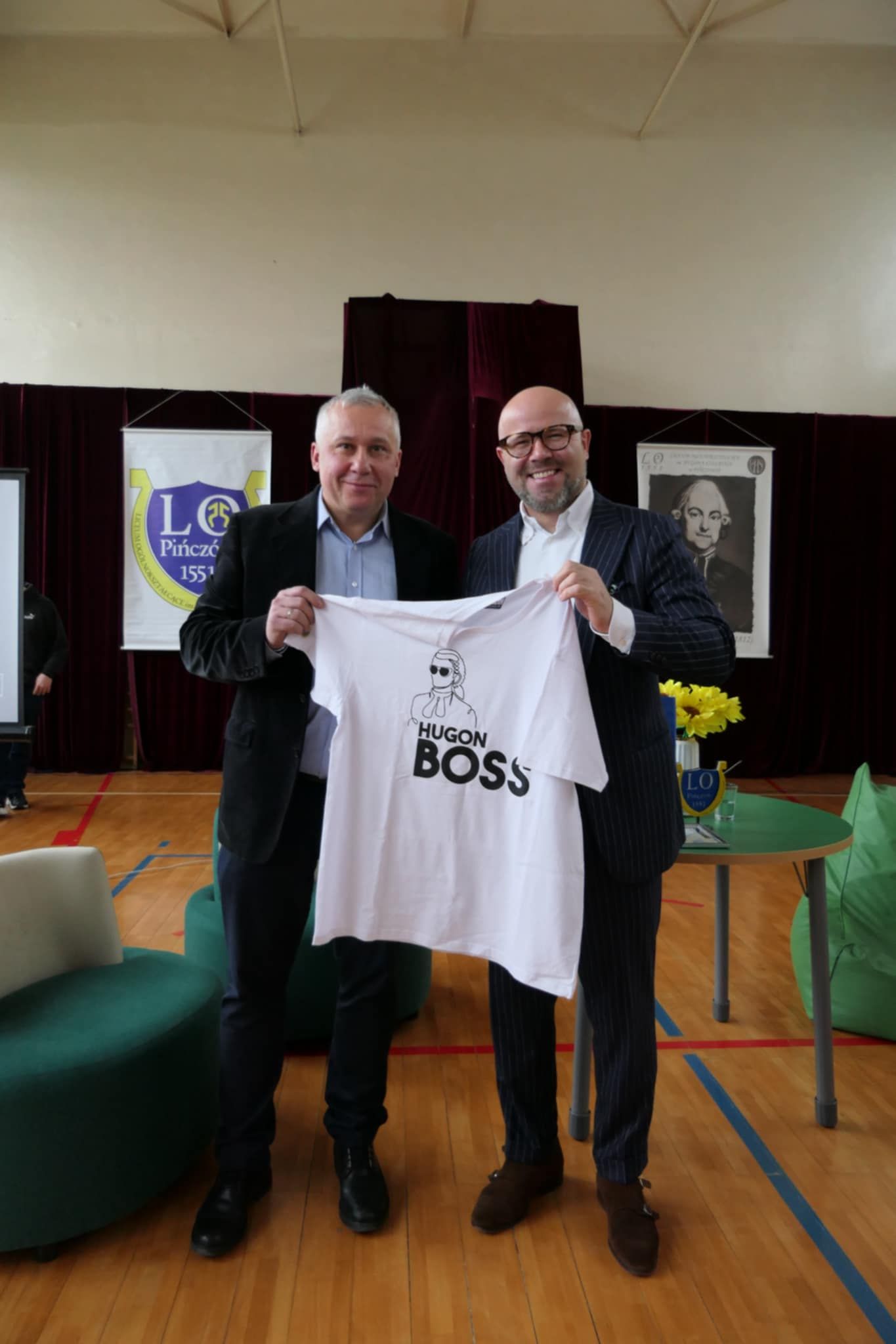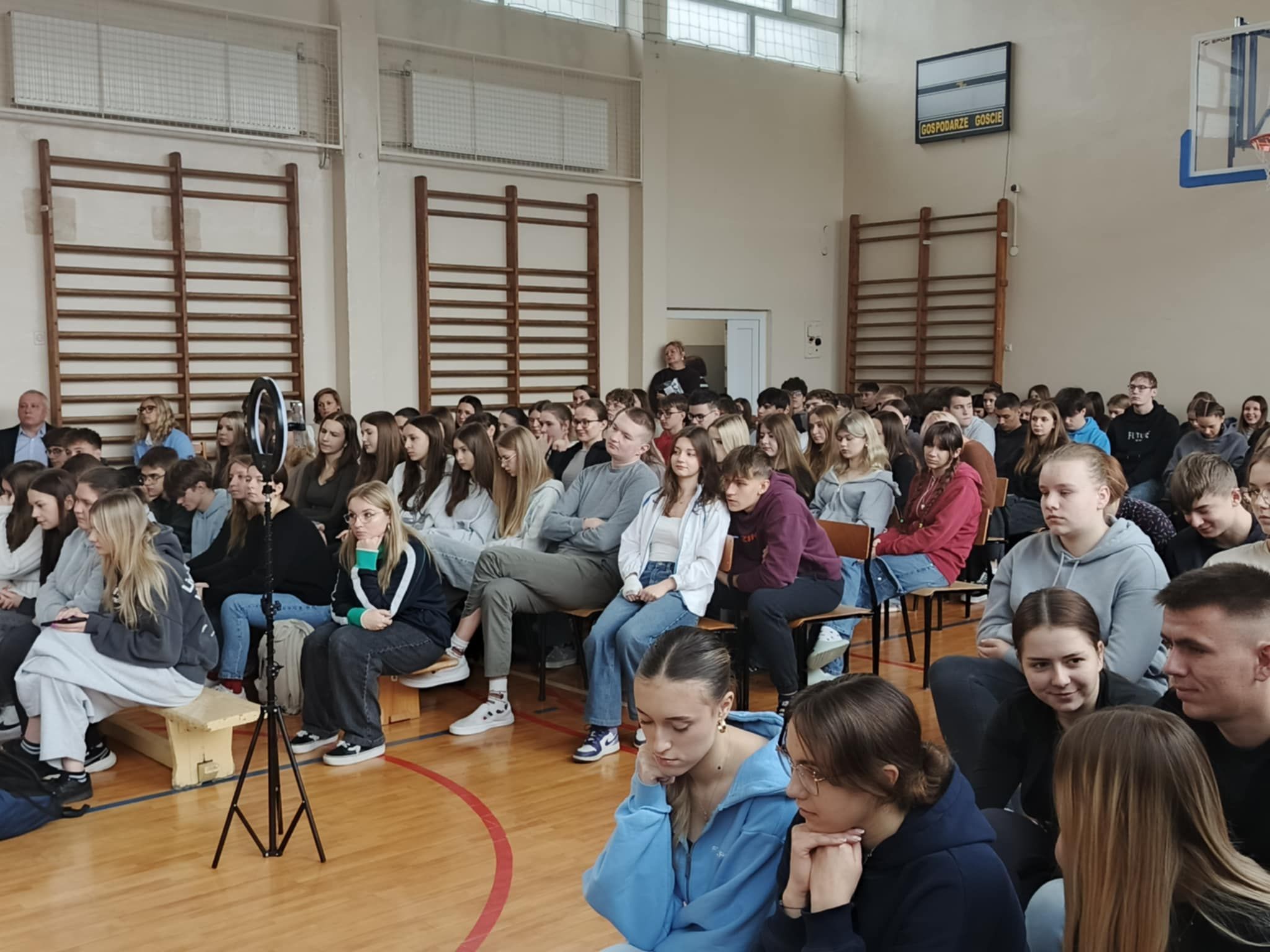 Gościa przywitał pan dyrektor Tomasz Pietrzykowski, natomiast spotkanie poprowadzili autorzy projektu: Maksymilian Kędzierski, Nela Pietrzykowska i Jan Kawiorski. W trakcie realizacji projektu byli oni także wspierani przez Natalię Młyńczak oraz Antoniego Michalskiego. Rozmowa dotyczyła ubraniowego savoir-vivre, związanego zarówno z ubiorem do szkoły, czyli jak na co dzień ubrać się wygodnie i estetycznie jednocześnie. Przede wszystkim jednak poruszano kwestię bardziej formalnych okazji, takich jak studniówka, osiemnastki czy uroczystości rodzinne. Pan Michał podzielił się wieloma praktycznymi wskazówkami, a także odpowiedział na liczne pytania uczniów zgromadzonych na sali. Opowiedział nie tylko o zasadach elegancji, ale także o swojej pracy i doświadczeniach z nią związanych. Dodatkową atrakcją była prezentacja jednej z technik wiązania krawata. Ta umiejętność z całą pewnością już niebawem przyda się naszym tegorocznym maturzystom przed studniówką i maturą. Podczas wydarzenia autorzy projektu podziękowali również jego patronowi, bez którego jego realizacja nie byłaby możliwa. Szczególne wyrazy wdzięczności kierujemy do ,,Stowarzyszenia Społeczno-Kulturalnego dla Ponidzia’’, reprezentowanego podczas spotkania przez panią Jadwigę Irlę oraz panią Grażynę Robak. Dziękujemy !![]()