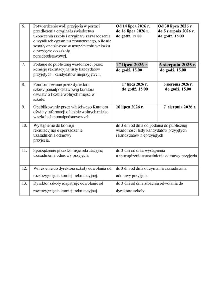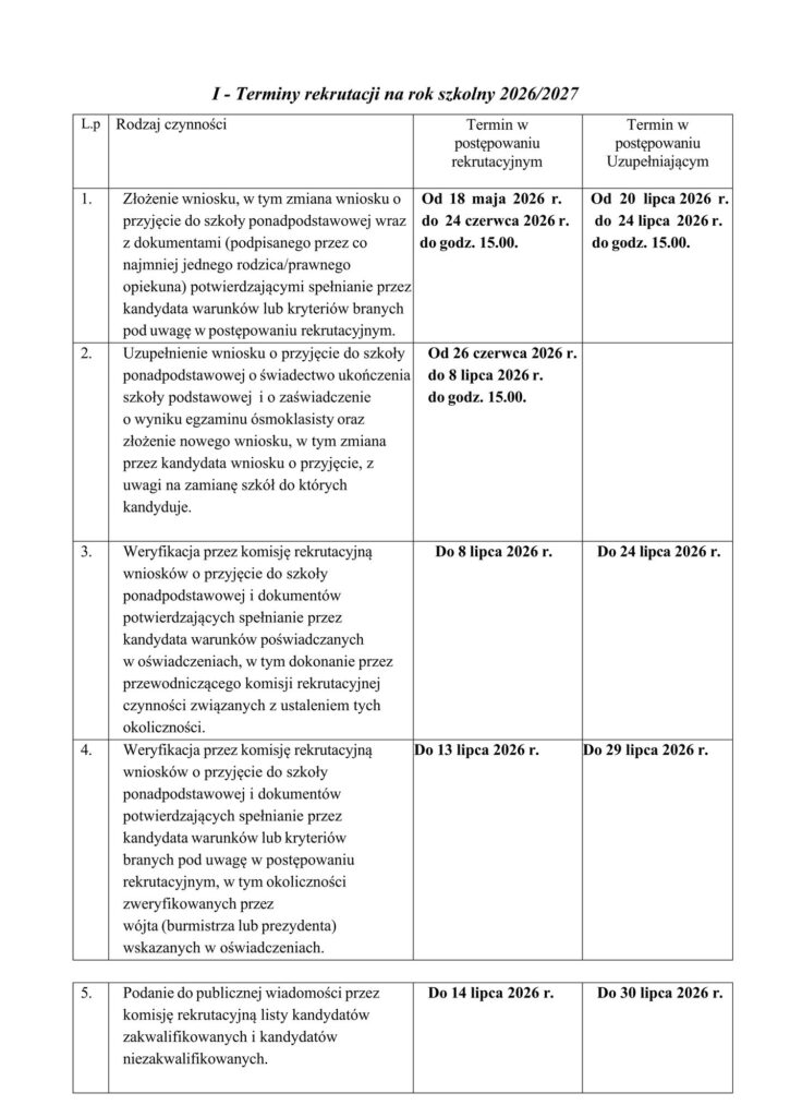 Poniżej znajdziesz najważniejsze terminy dotyczące rekrutacji na rok szkolny 2026/2027